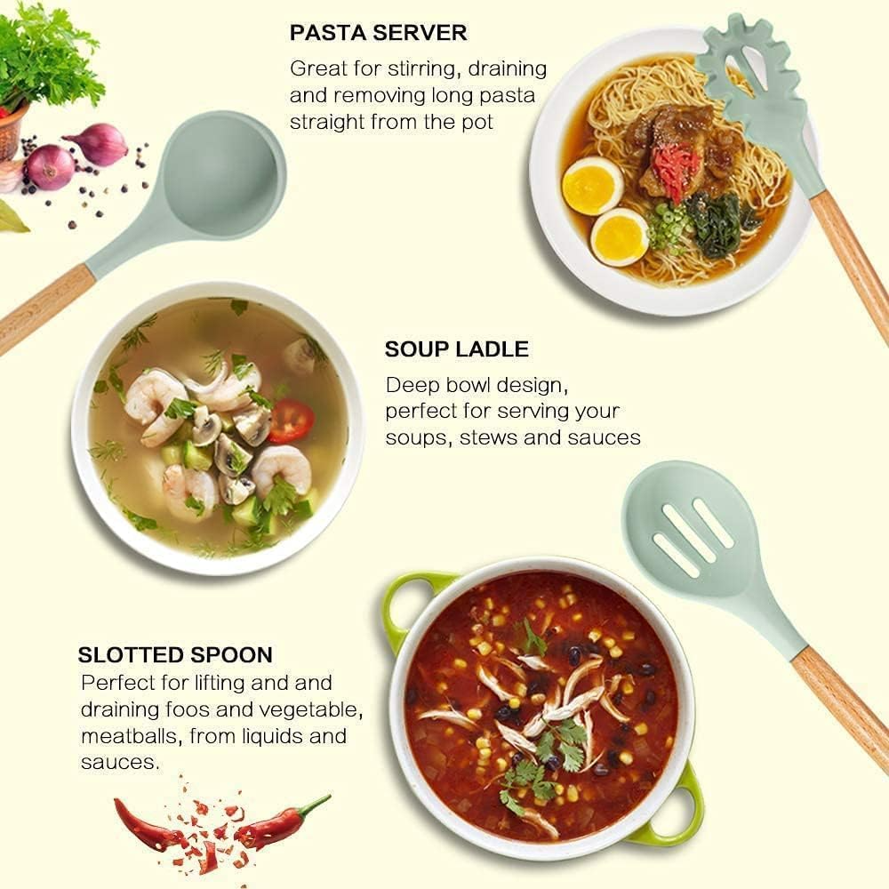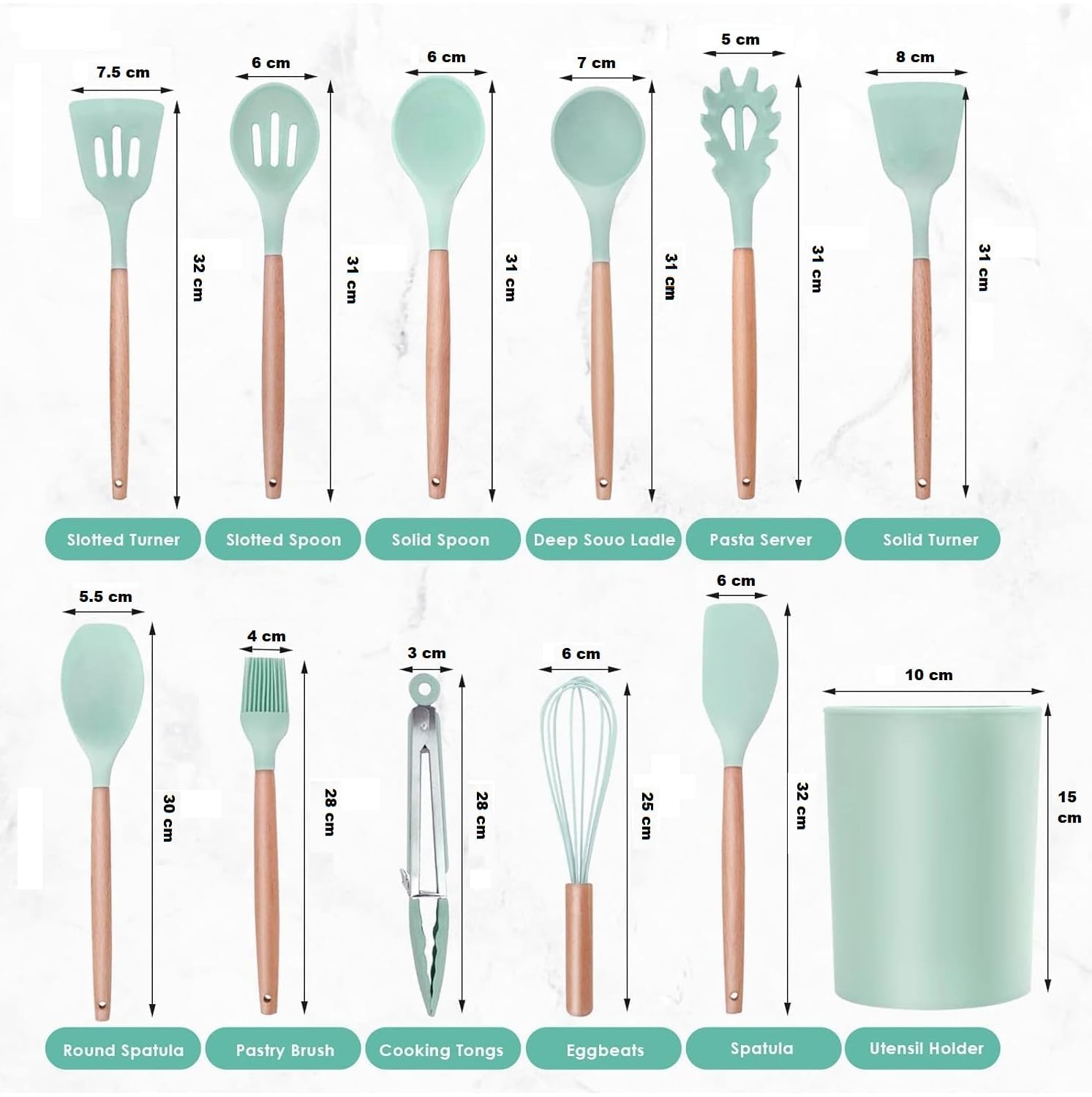 Aspiral Premium 12-Piece Silicone Kitchen Utensil Set with Wooden Handles & Storage Holder | Heat Resistant Non-Stick Cooking Tools (Green)